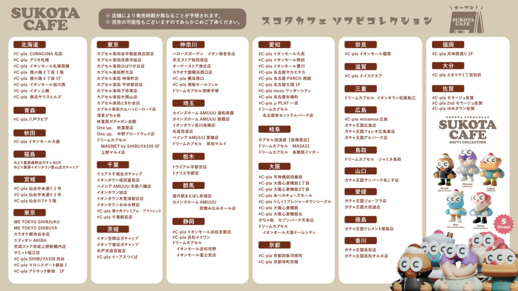 | トイズキャビン | C-pla、ヴィレッジヴァンガード、ロフト、ドン・キホーテ、ヨドバシカメラ、ビックカメラ、ジュンク堂、TSUTAYA、WonderGOO、namco、セガ、地域のホビーショップや中古ショップ など |