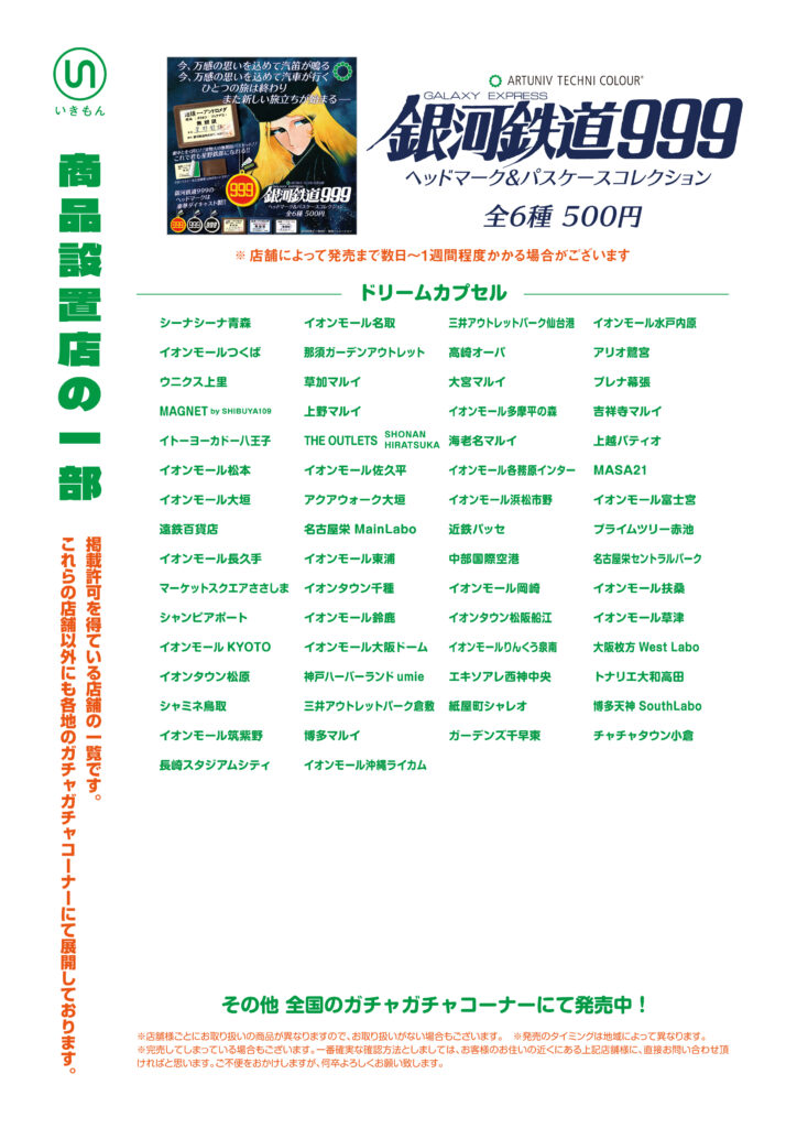 | バンダイ(ガシャポン) | イオンモール(ガシャポンのデパート)、ヨドバシカメラ、ビックカメラ、エディオン、JR駅構内、コンビニ、namco、ラウンドワン、タイトーステーション、トイザらス、ロフト、ドン・キホーテ、紀伊國屋書店、TSUTAYA など |