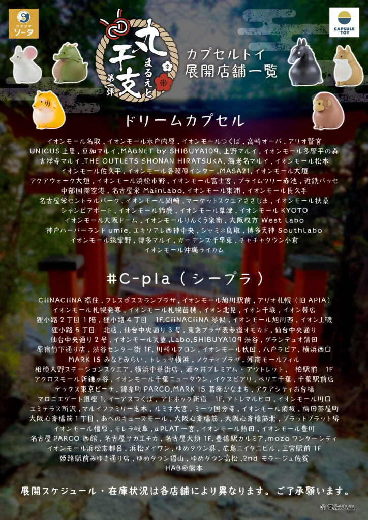 | バンダイ(ガシャポン) | イオンモール(ガシャポンのデパート)、ヨドバシカメラ、ビックカメラ、エディオン、JR駅構内、コンビニ、namco、ラウンドワン、タイトーステーション、トイザらス、ロフト、ドン・キホーテ、紀伊國屋書店、TSUTAYA など |