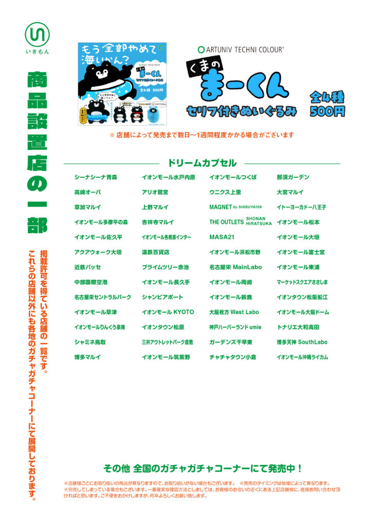 ガシャポン(バンダイ)イオンモール(ガシャポンのデパート)、ヨドバシカメラ、ビックカメラ、エディオン、JR駅構内、コンビニ、namco、ラウンドワン、タイトーステーション、トイザらス、ロフト、ドン・キホーテ、紀伊國屋書店、TSUTAYA など
