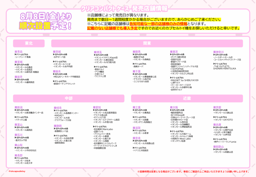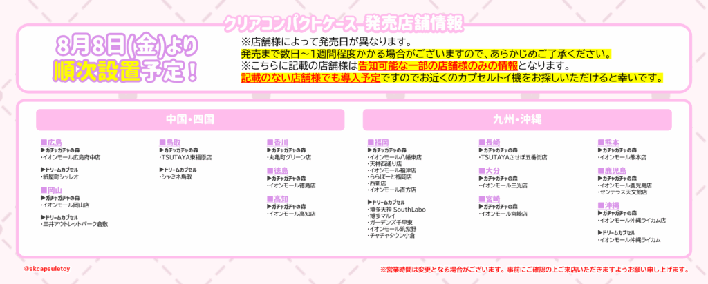 ガシャポン(バンダイ)イオンモール(ガシャポンのデパート)、ヨドバシカメラ、ビックカメラ、エディオン、JR駅構内、コンビニ、namco、ラウンドワン、タイトーステーション、トイザらス、ロフト、ドン・キホーテ、紀伊國屋書店、TSUTAYA など