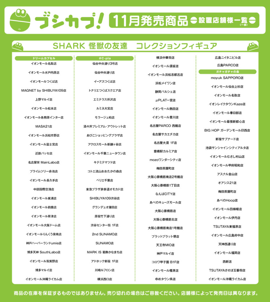 | バンダイ(ガシャポン) | イオンモール(ガシャポンのデパート)、ヨドバシカメラ、ビックカメラ、エディオン、JR駅構内、コンビニ、namco、ラウンドワン、タイトーステーション、トイザらス、ロフト、ドン・キホーテ、紀伊國屋書店、TSUTAYA など |
