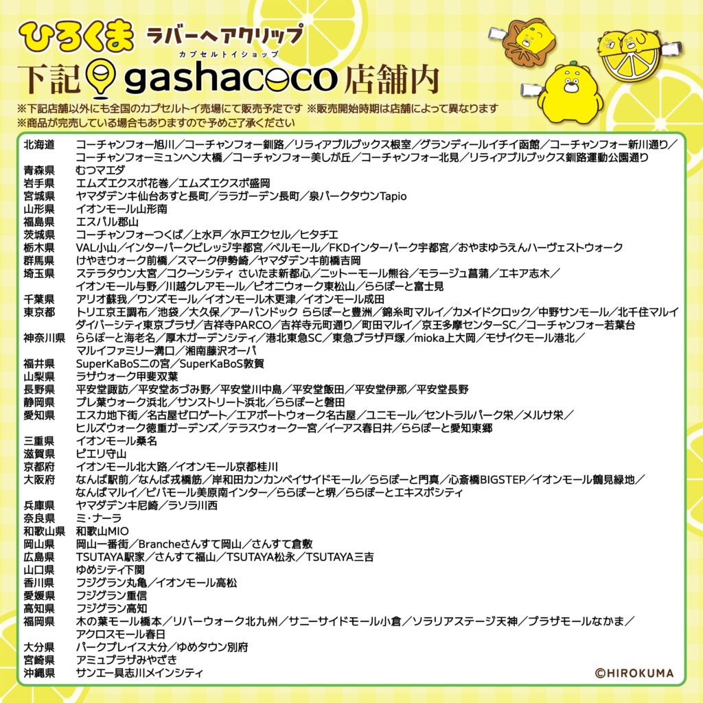 ガシャポン(バンダイ)イオンモール(ガシャポンのデパート)、ヨドバシカメラ、ビックカメラ、エディオン、JR駅構内、コンビニ、namco、ラウンドワン、タイトーステーション、トイザらス、ロフト、ドン・キホーテ、紀伊國屋書店、TSUTAYA など