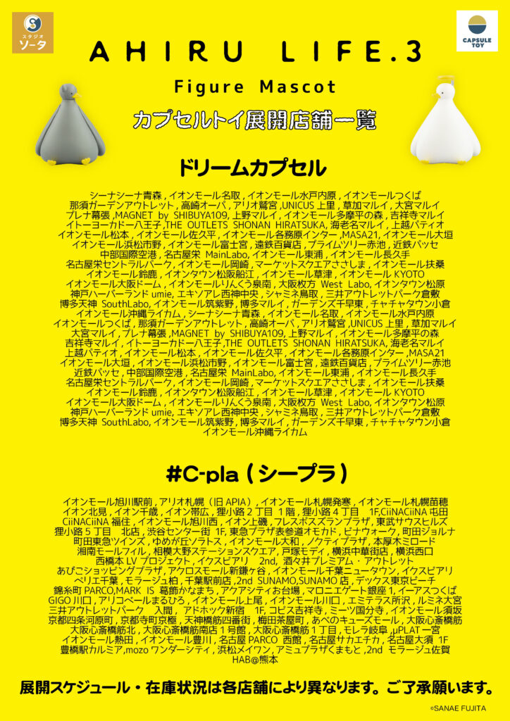 | トイズキャビン | C-pla、ヴィレッジヴァンガード、ロフト、ドン・キホーテ、ヨドバシカメラ、ビックカメラ、ジュンク堂、TSUTAYA、WonderGOO、namco、セガ、地域のホビーショップや中古ショップ など |