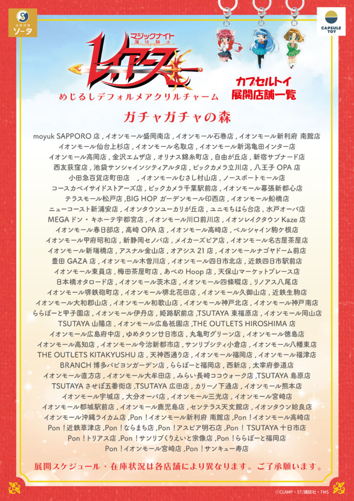 | タカラトミーアーツ | イオン、イトーヨーカドー、アカチャンホンポ、空港、ジュンク堂、TSUTAYA、文教堂、PLAZA、ロフト、ヴィレッジヴァンガード、東急ハンズ、ドン・キホーテ、マツモトキヨシ、セガ、ナムコ など |
