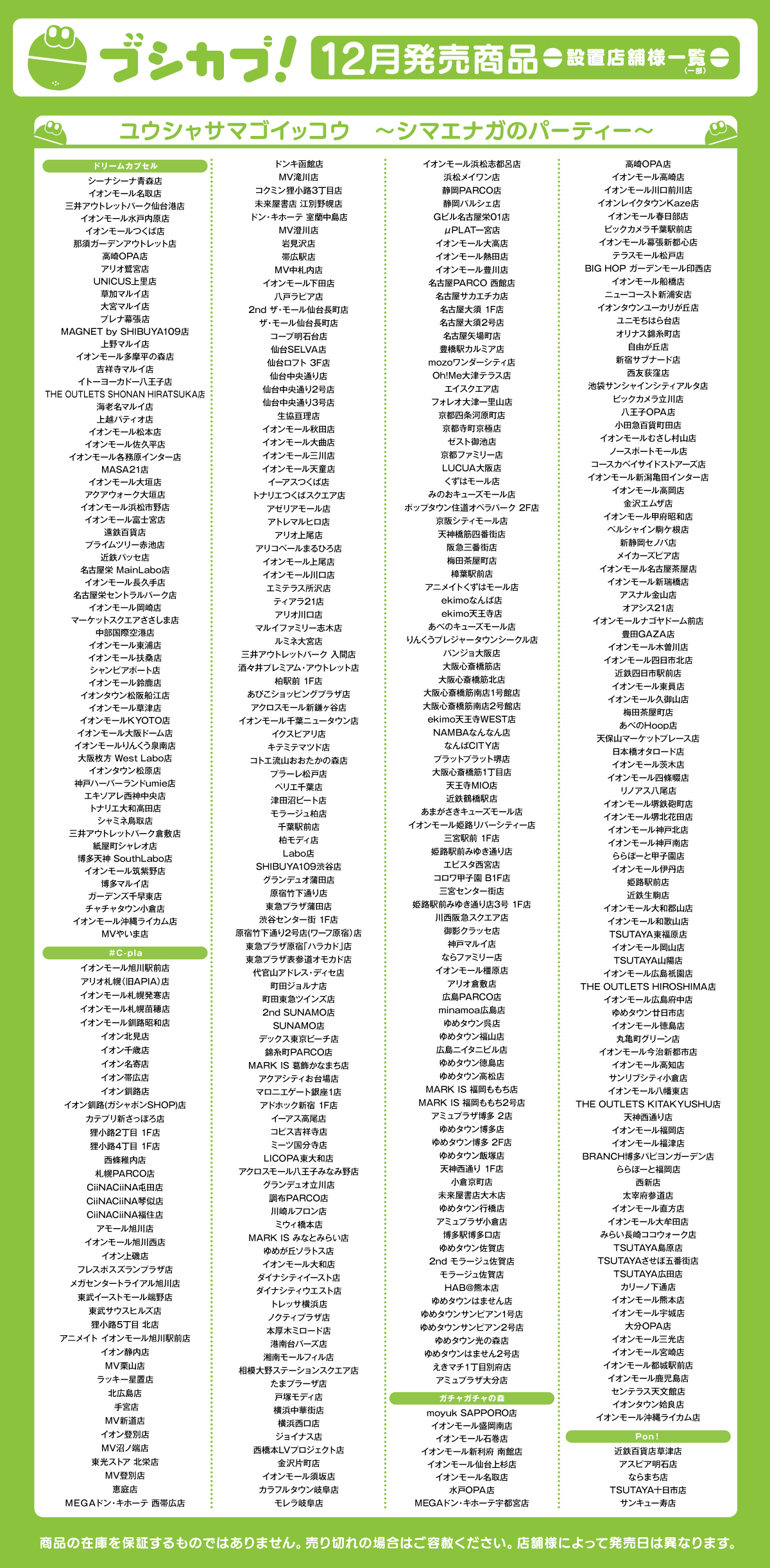 | トイズキャビン | C-pla、ヴィレッジヴァンガード、ロフト、ドン・キホーテ、ヨドバシカメラ、ビックカメラ、ジュンク堂、TSUTAYA、WonderGOO、namco、セガ、地域のホビーショップや中古ショップ など |