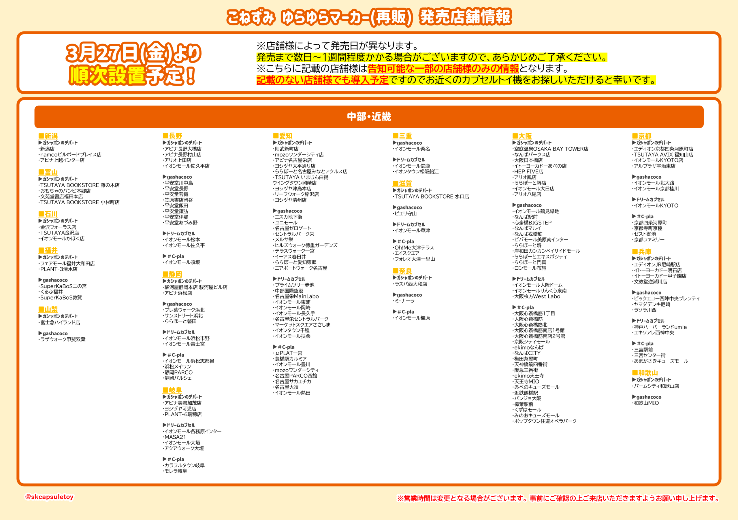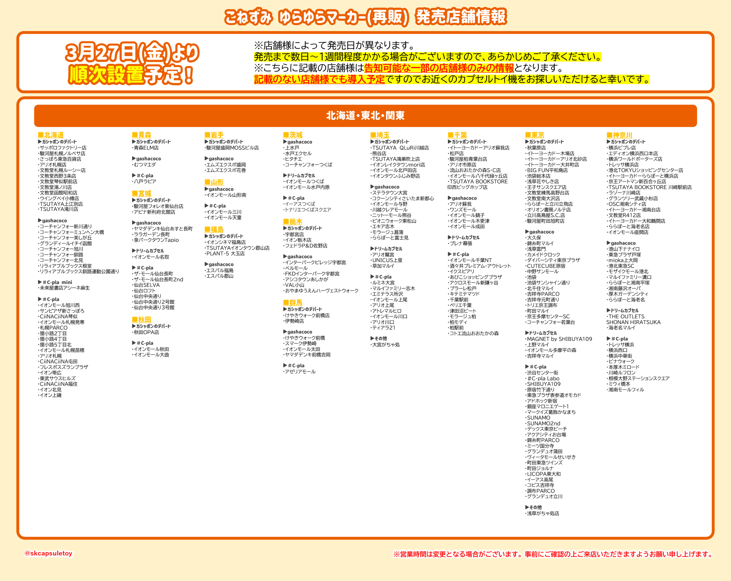 バンダイ(ガシャポン)イオンモール(ガシャポンのデパート)、ヨドバシカメラ、ビックカメラ、エディオン、JR駅構内、コンビニ、namco、ラウンドワン、タイトーステーション、トイザらス、ロフト、ドン・キホーテ、紀伊國屋書店、TSUTAYA など