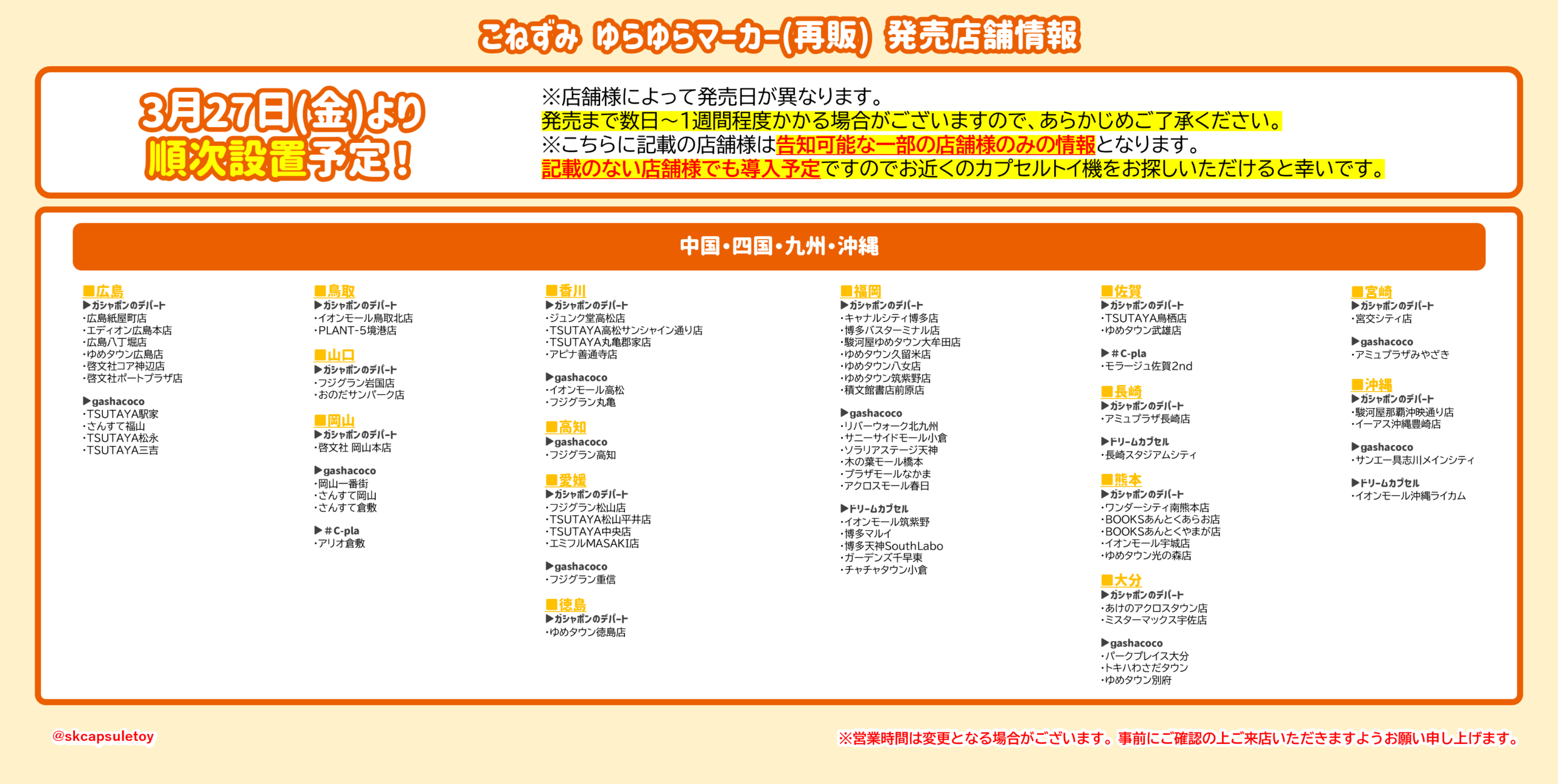 トイズキャビンC-pla、ヴィレッジヴァンガード、ロフト、ドン・キホーテ、ヨドバシカメラ、ビックカメラ、ジュンク堂、TSUTAYA、WonderGOO、namco、セガ、地域のホビーショップや中古ショップ など