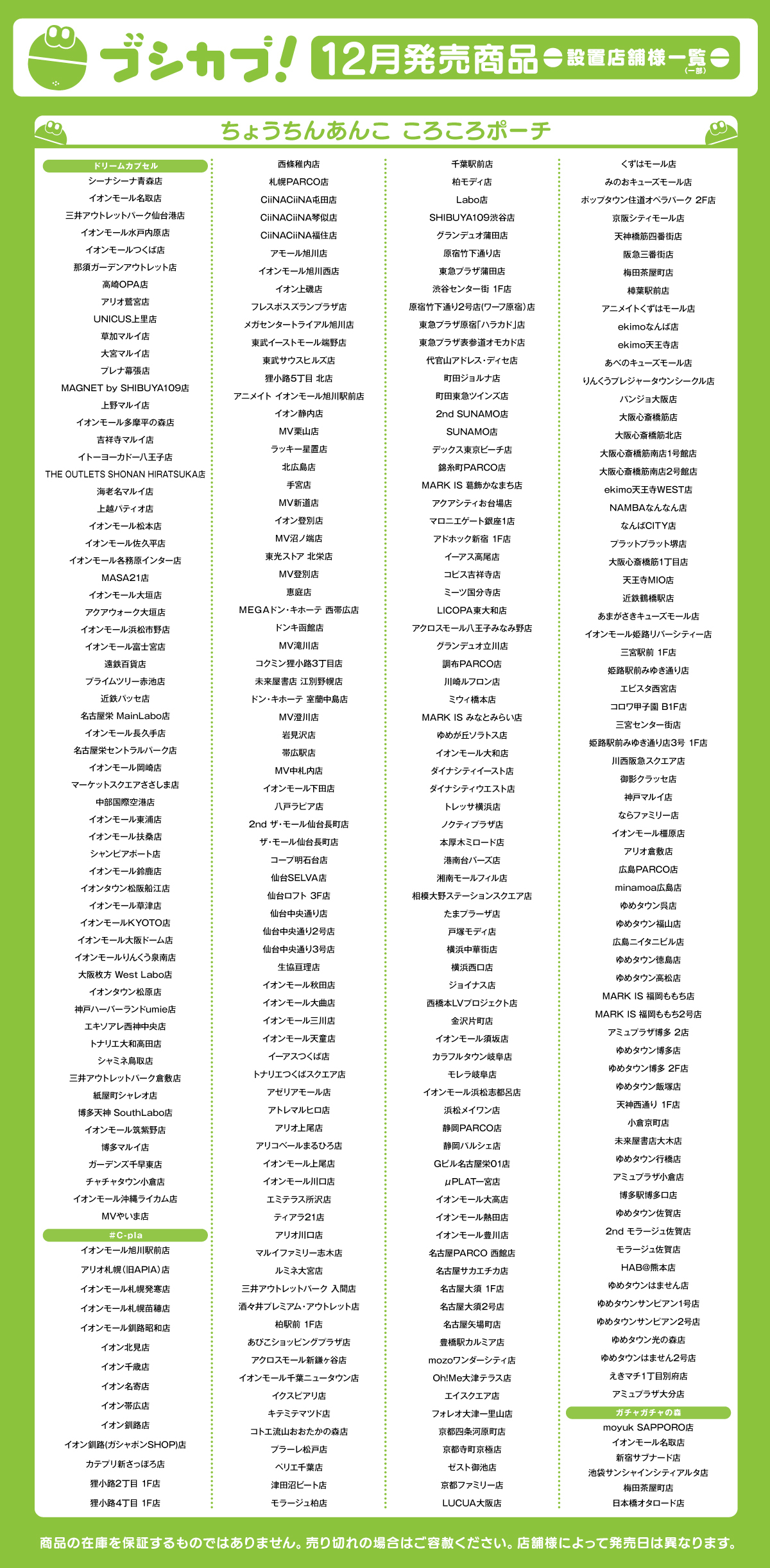 | トイズキャビン | C-pla、ヴィレッジヴァンガード、ロフト、ドン・キホーテ、ヨドバシカメラ、ビックカメラ、ジュンク堂、TSUTAYA、WonderGOO、namco、セガ、地域のホビーショップや中古ショップ など |