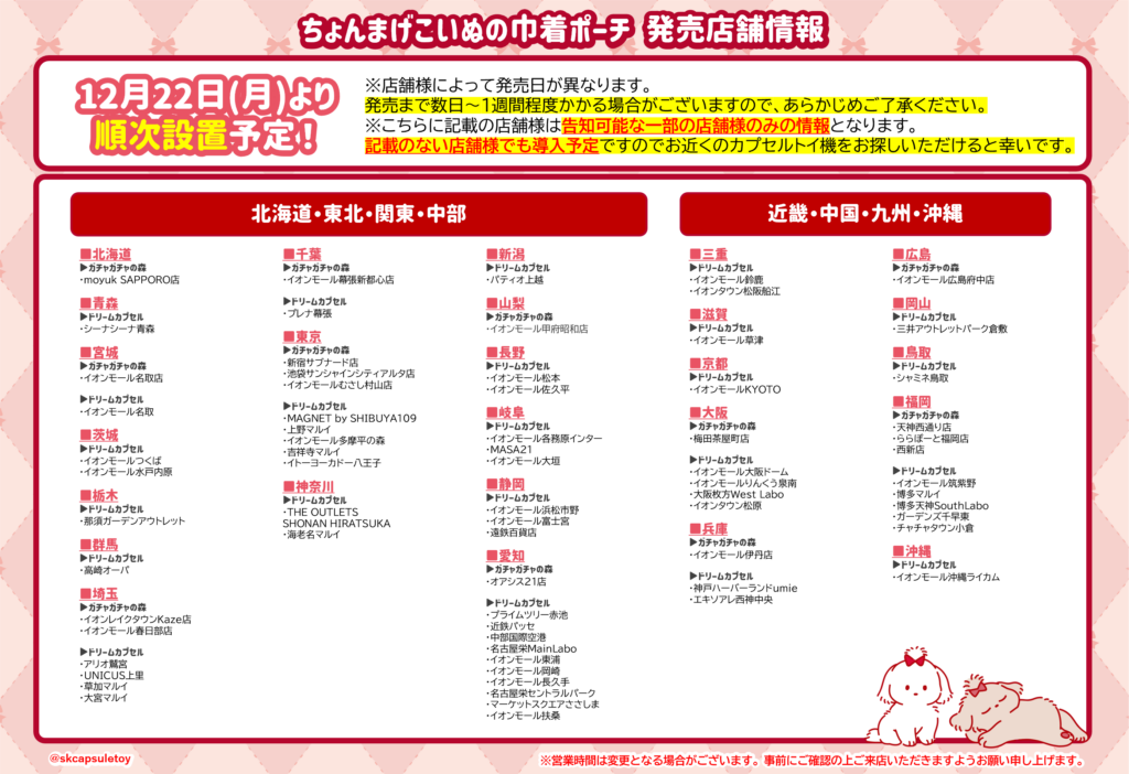 | バンダイ(ガシャポン) | イオンモール(ガシャポンのデパート)、ヨドバシカメラ、ビックカメラ、エディオン、JR駅構内、コンビニ、namco、ラウンドワン、タイトーステーション、トイザらス、ロフト、ドン・キホーテ、紀伊國屋書店、TSUTAYA など |