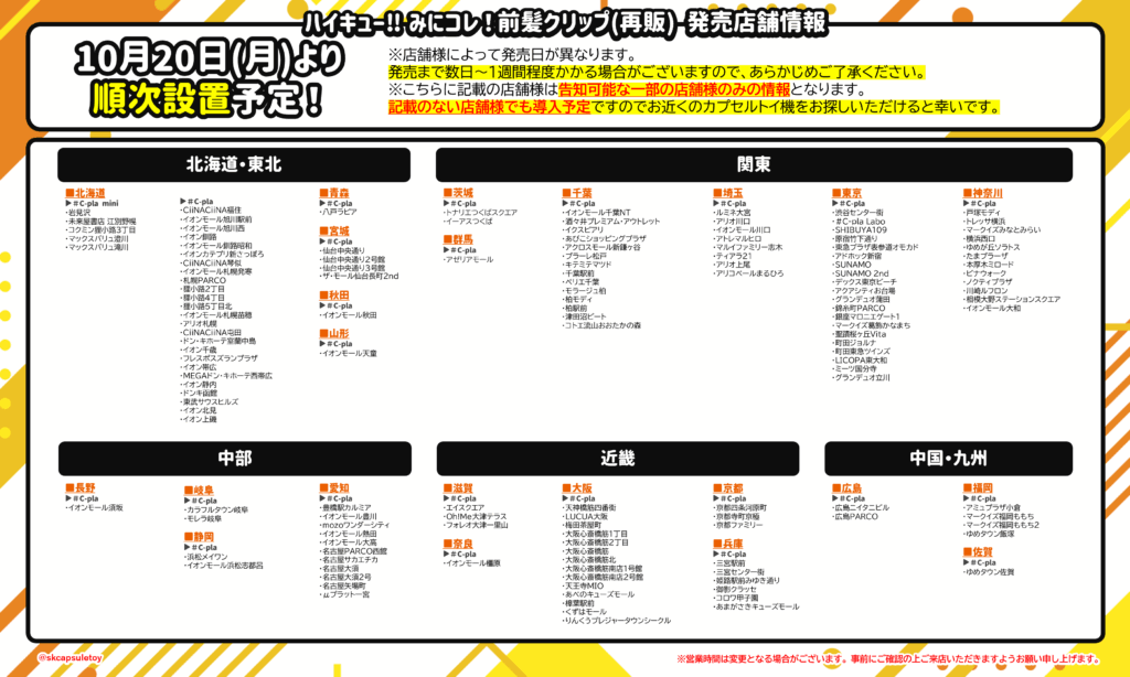 | トイズキャビン | C-pla、ヴィレッジヴァンガード、ロフト、ドン・キホーテ、ヨドバシカメラ、ビックカメラ、ジュンク堂、TSUTAYA、WonderGOO、namco、セガ、地域のホビーショップや中古ショップ など |