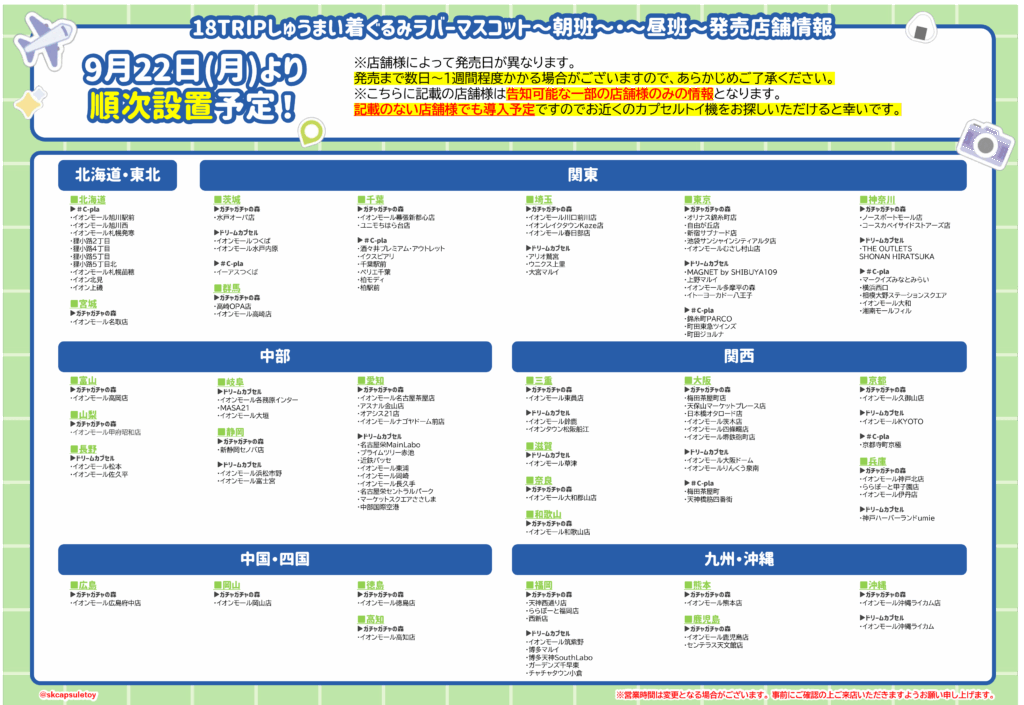 | タカラトミーアーツ | イオン、イトーヨーカドー、アカチャンホンポ、空港、ジュンク堂、TSUTAYA、文教堂、PLAZA、ロフト、ヴィレッジヴァンガード、東急ハンズ、ドン・キホーテ、マツモトキヨシ、セガ、ナムコ など |