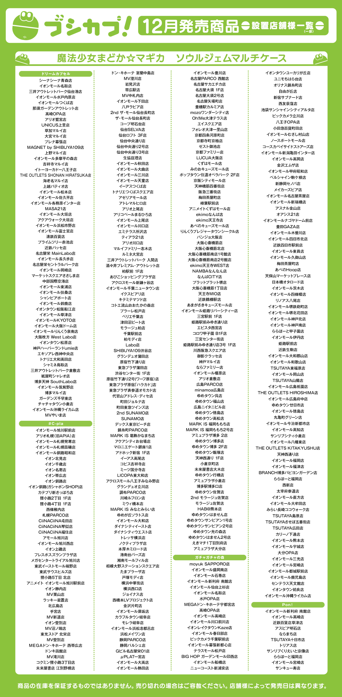 バンダイ(ガシャポン)イオンモール(ガシャポンのデパート)、ヨドバシカメラ、ビックカメラ、エディオン、JR駅構内、コンビニ、namco、ラウンドワン、タイトーステーション、トイザらス、ロフト、ドン・キホーテ、紀伊國屋書店、TSUTAYA など
