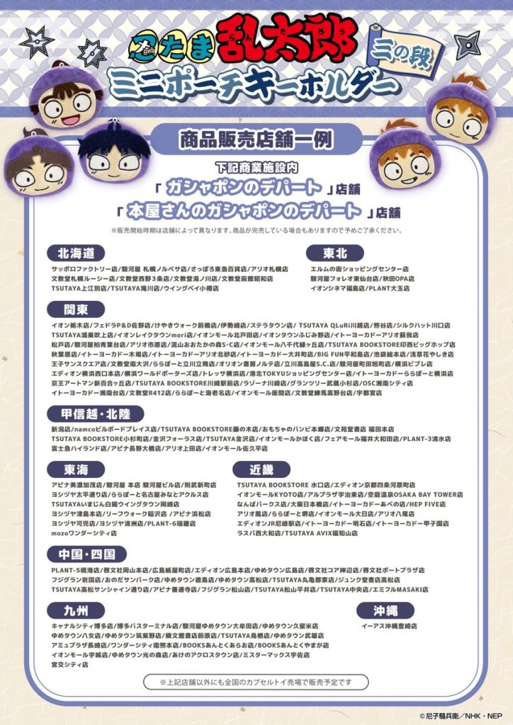 | バンダイ(ガシャポン) | イオンモール(ガシャポンのデパート)、ヨドバシカメラ、ビックカメラ、エディオン、JR駅構内、コンビニ、namco、ラウンドワン、タイトーステーション、トイザらス、ロフト、ドン・キホーテ、紀伊國屋書店、TSUTAYA など |