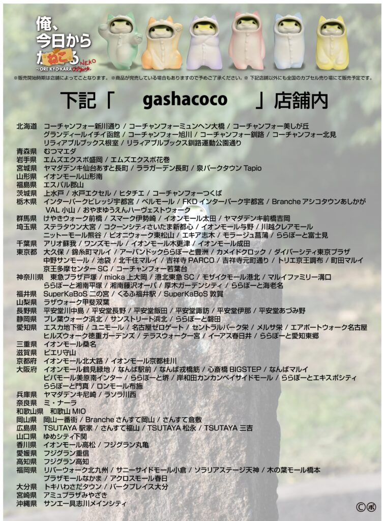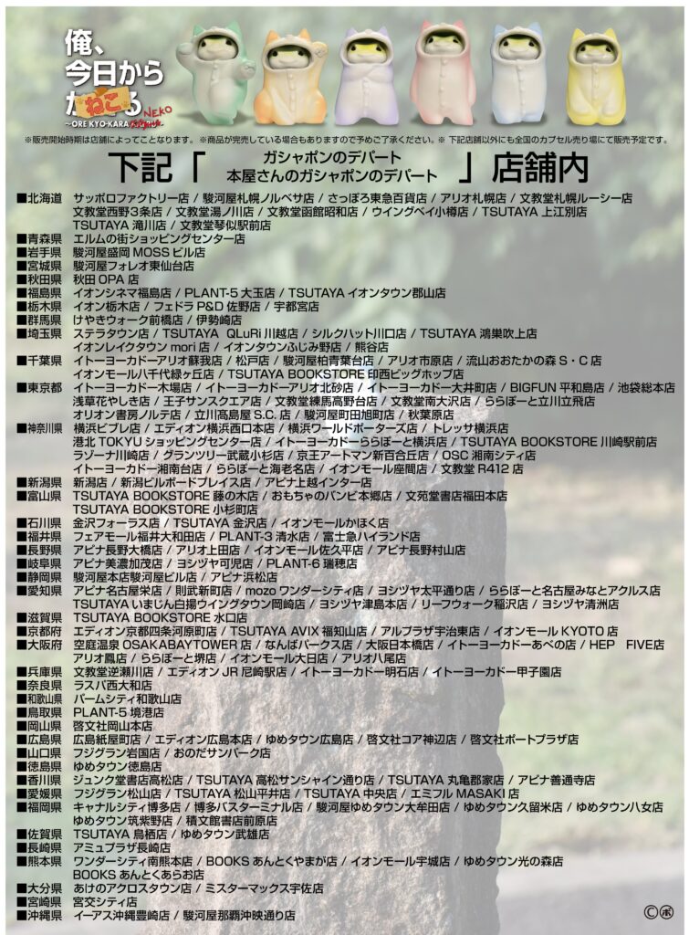 バンダイ(ガシャポン)イオンモール(ガシャポンのデパート)、ヨドバシカメラ、ビックカメラ、エディオン、JR駅構内、コンビニ、namco、ラウンドワン、タイトーステーション、トイザらス、ロフト、ドン・キホーテ、紀伊國屋書店、TSUTAYA など