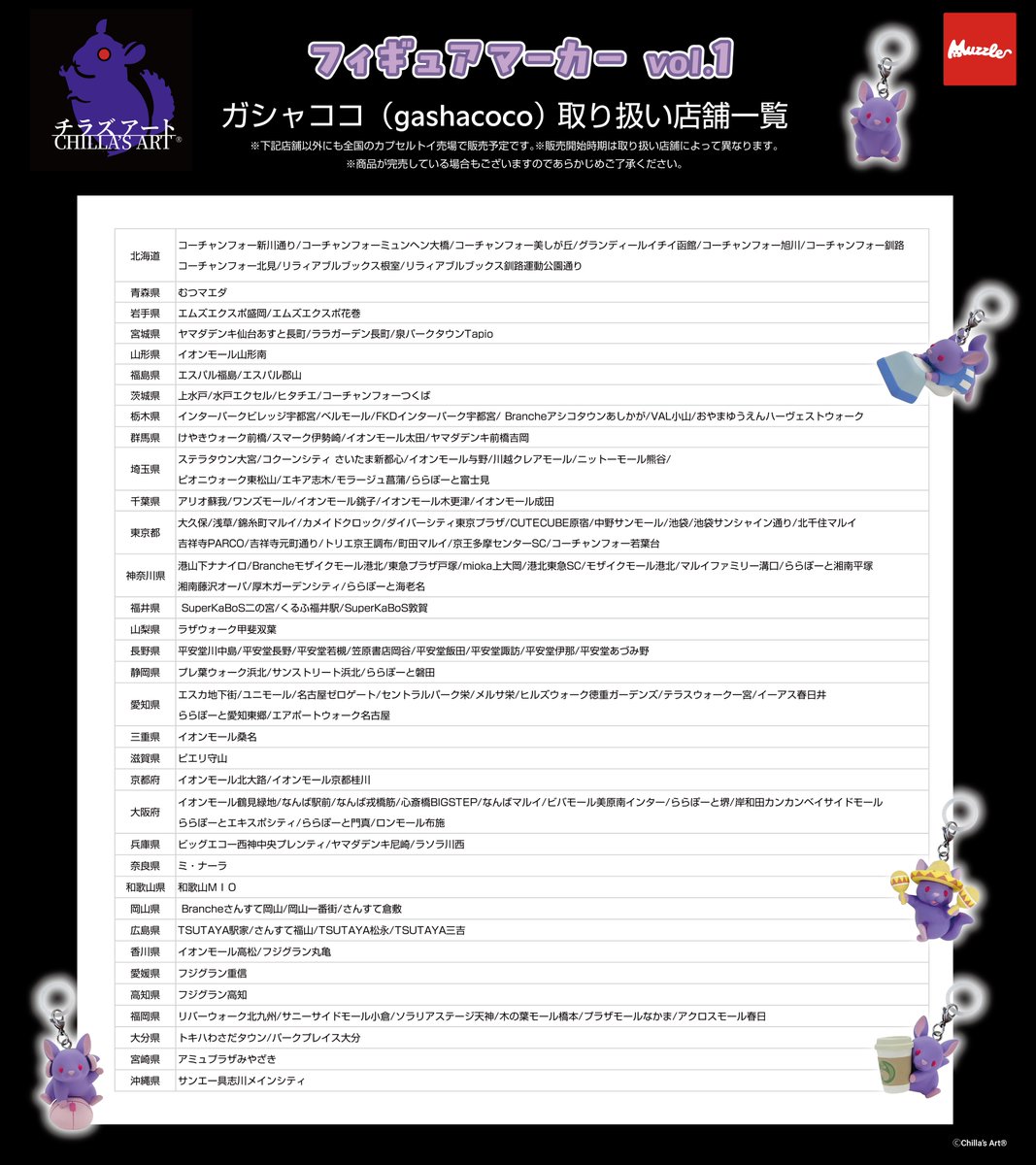 | バンダイ(ガシャポン) | イオンモール(ガシャポンのデパート)、ヨドバシカメラ、ビックカメラ、エディオン、JR駅構内、コンビニ、namco、ラウンドワン、タイトーステーション、トイザらス、ロフト、ドン・キホーテ、紀伊國屋書店、TSUTAYA など |