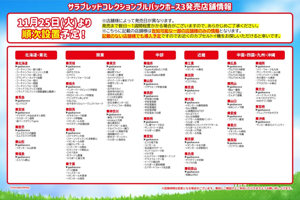 | バンダイ(ガシャポン) | イオンモール(ガシャポンのデパート)、ヨドバシカメラ、ビックカメラ、エディオン、JR駅構内、コンビニ、namco、ラウンドワン、タイトーステーション、トイザらス、ロフト、ドン・キホーテ、紀伊國屋書店、TSUTAYA など |