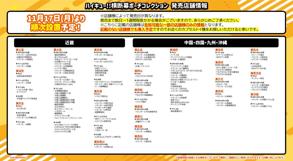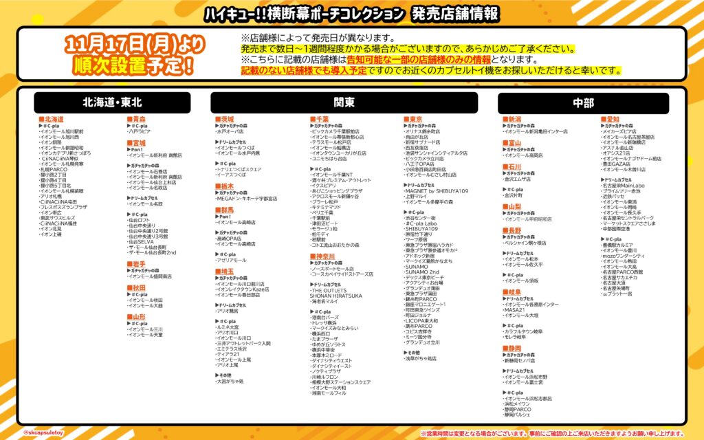 | バンダイ(ガシャポン) | イオンモール(ガシャポンのデパート)、ヨドバシカメラ、ビックカメラ、エディオン、JR駅構内、コンビニ、namco、ラウンドワン、タイトーステーション、トイザらス、ロフト、ドン・キホーテ、紀伊國屋書店、TSUTAYA など |