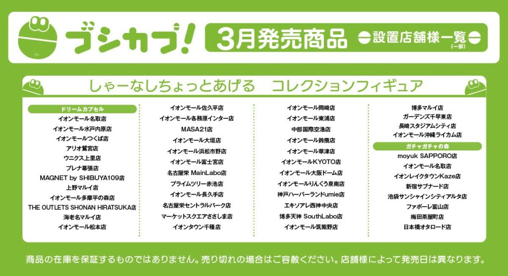 バンダイ(ガシャポン)イオンモール(ガシャポンのデパート)、ヨドバシカメラ、ビックカメラ、エディオン、JR駅構内、コンビニ、namco、ラウンドワン、タイトーステーション、トイザらス、ロフト、ドン・キホーテ、紀伊國屋書店、TSUTAYA など
