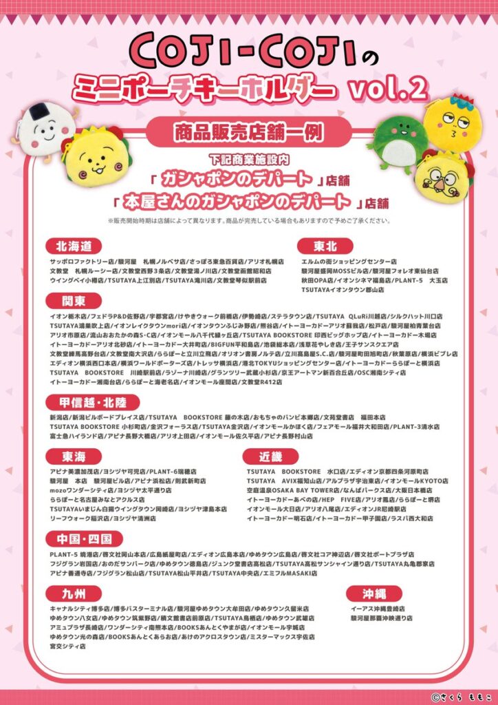 | バンダイ(ガシャポン) | イオンモール(ガシャポンのデパート)、ヨドバシカメラ、ビックカメラ、エディオン、JR駅構内、コンビニ、namco、ラウンドワン、タイトーステーション、トイザらス、ロフト、ドン・キホーテ、紀伊國屋書店、TSUTAYA など |