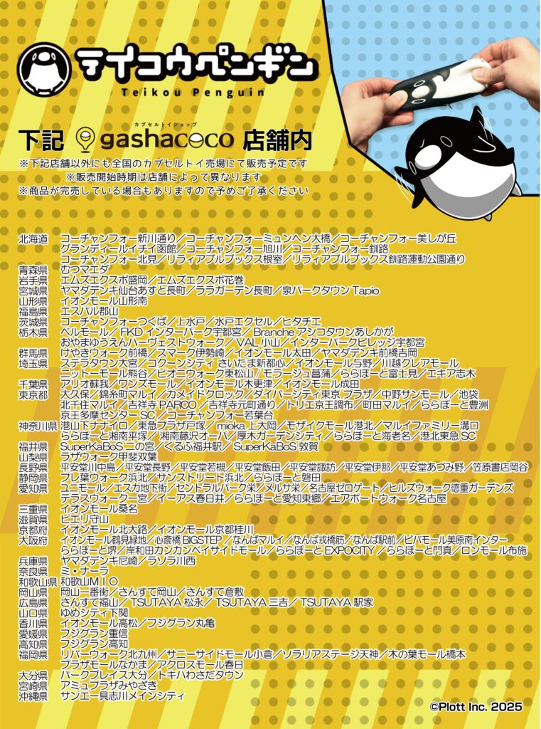 バンダイ(ガシャポン)イオンモール(ガシャポンのデパート)、ヨドバシカメラ、ビックカメラ、エディオン、JR駅構内、コンビニ、namco、ラウンドワン、タイトーステーション、トイザらス、ロフト、ドン・キホーテ、紀伊國屋書店、TSUTAYA など