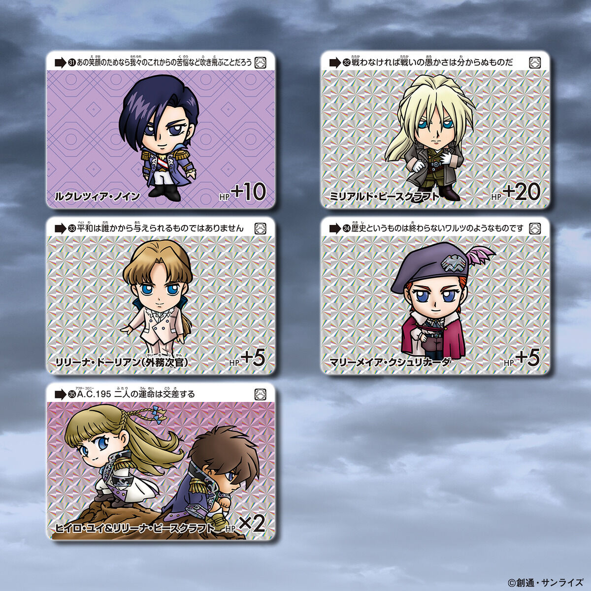 『新機動戦記ガンダムW Endless Waltz』も含む多数のモビルスーツやキャラクターが、ディフォルメされて全35種(うち1種シークレットを含む)のSDガンダムカードダスとして登場!