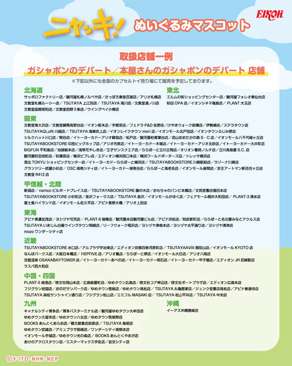 | タカラトミーアーツ | イオン、イトーヨーカドー、アカチャンホンポ、空港、ジュンク堂、TSUTAYA、文教堂、PLAZA、ロフト、ヴィレッジヴァンガード、東急ハンズ、ドン・キホーテ、マツモトキヨシ、セガ、ナムコ など |