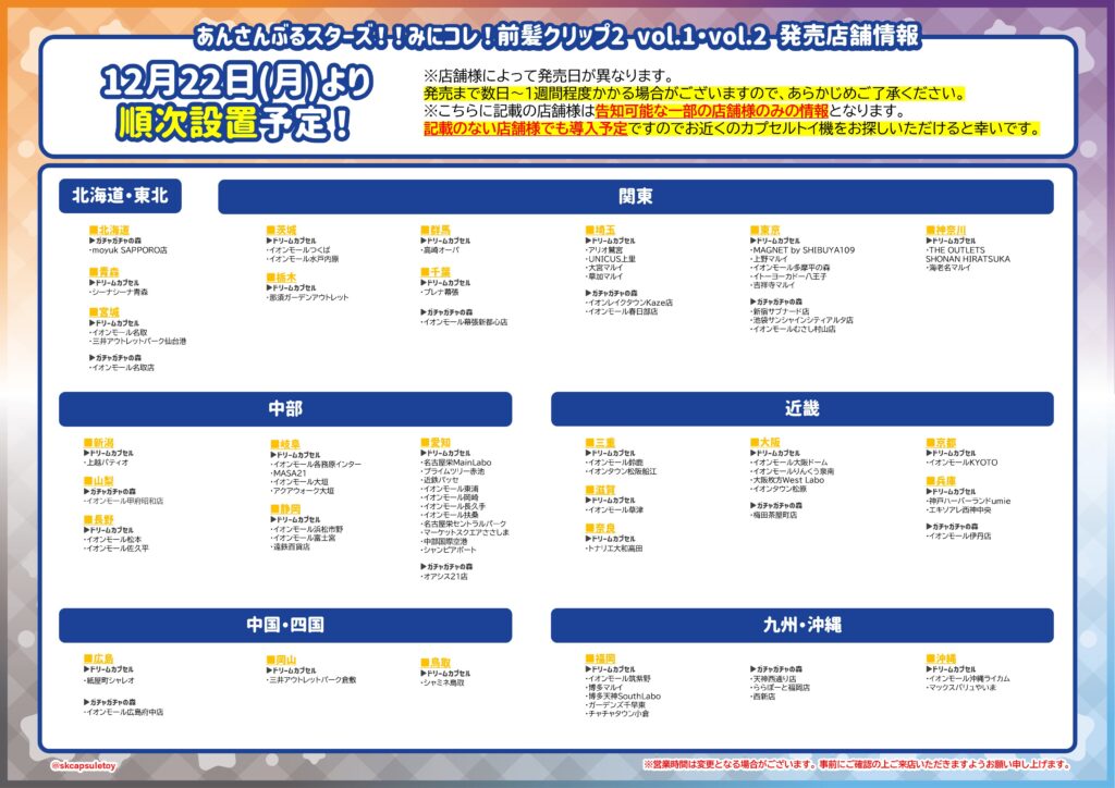バンダイ(ガシャポン)イオンモール(ガシャポンのデパート)、ヨドバシカメラ、ビックカメラ、エディオン、JR駅構内、コンビニ、namco、ラウンドワン、タイトーステーション、トイザらス、ロフト、ドン・キホーテ、紀伊國屋書店、TSUTAYA など