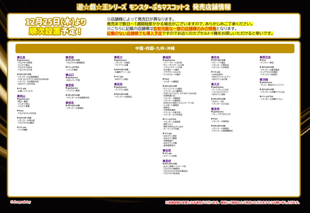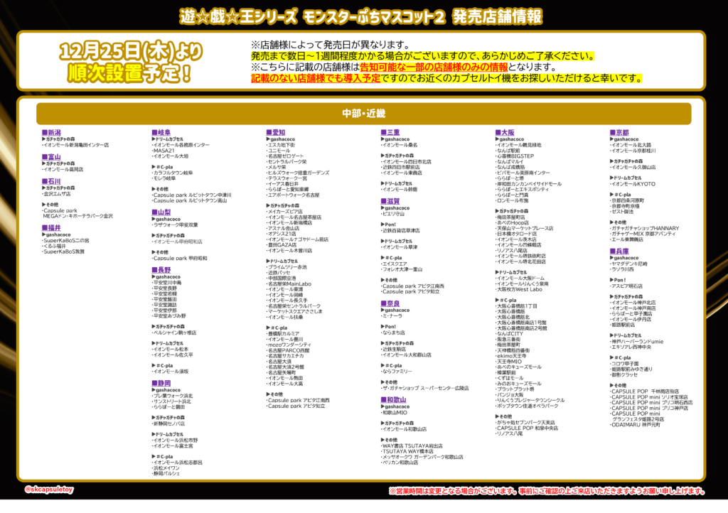 バンダイ(ガシャポン)イオンモール(ガシャポンのデパート)、ヨドバシカメラ、ビックカメラ、エディオン、JR駅構内、コンビニ、namco、ラウンドワン、タイトーステーション、トイザらス、ロフト、ドン・キホーテ、紀伊國屋書店、TSUTAYA など