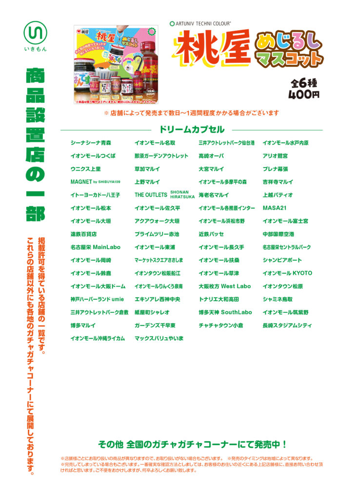バンダイ(ガシャポン)イオンモール(ガシャポンのデパート)、ヨドバシカメラ、ビックカメラ、エディオン、JR駅構内、コンビニ、namco、ラウンドワン、タイトーステーション、トイザらス、ロフト、ドン・キホーテ、紀伊國屋書店、TSUTAYA など
