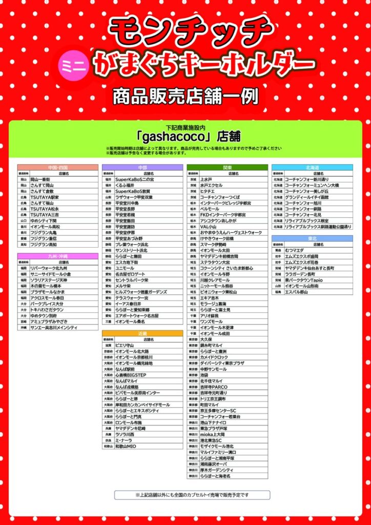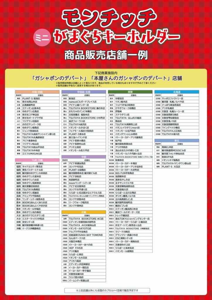 | バンダイ(ガシャポン) | イオンモール(ガシャポンのデパート)、ヨドバシカメラ、ビックカメラ、エディオン、JR駅構内、コンビニ、namco、ラウンドワン、タイトーステーション、トイザらス、ロフト、ドン・キホーテ、紀伊國屋書店、TSUTAYA など |