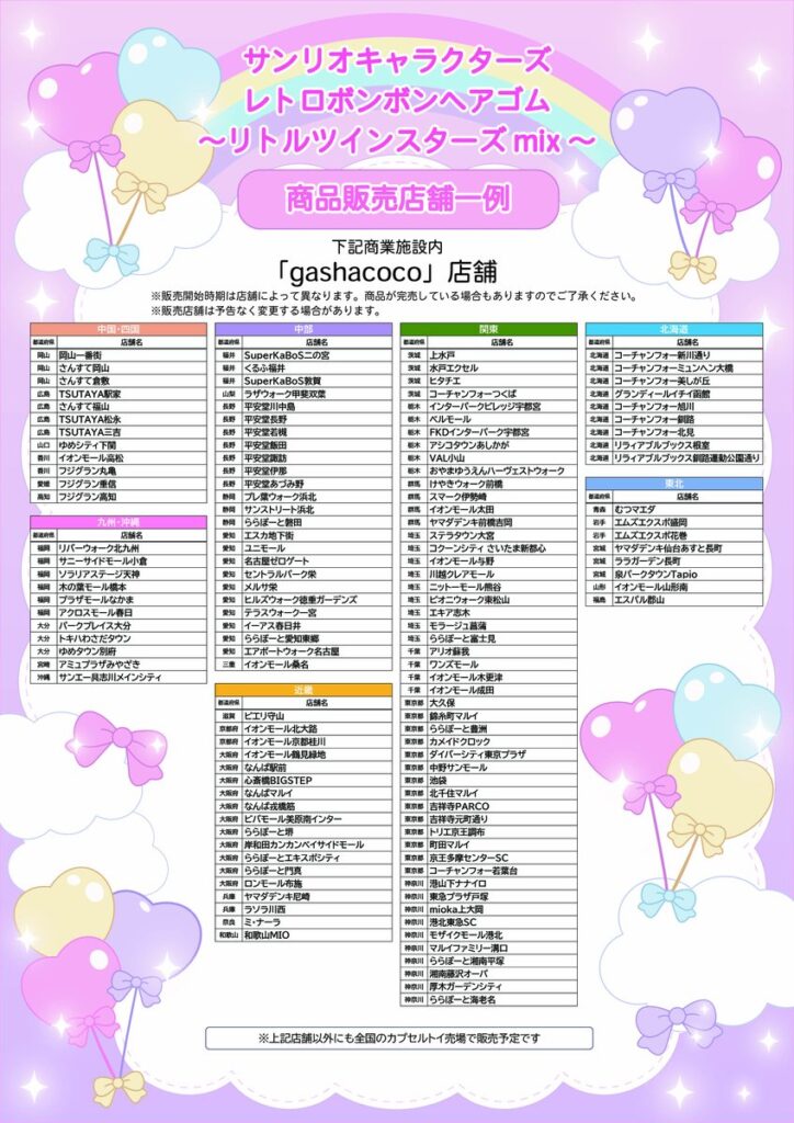 バンダイ(ガシャポン)イオンモール(ガシャポンのデパート)、ヨドバシカメラ、ビックカメラ、エディオン、JR駅構内、コンビニ、namco、ラウンドワン、タイトーステーション、トイザらス、ロフト、ドン・キホーテ、紀伊國屋書店、TSUTAYA など