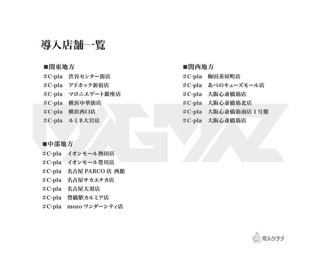 | トイズキャビン | C-pla、ヴィレッジヴァンガード、ロフト、ドン・キホーテ、ヨドバシカメラ、ビックカメラ、ジュンク堂、TSUTAYA、WonderGOO、namco、セガ、地域のホビーショップや中古ショップ など |