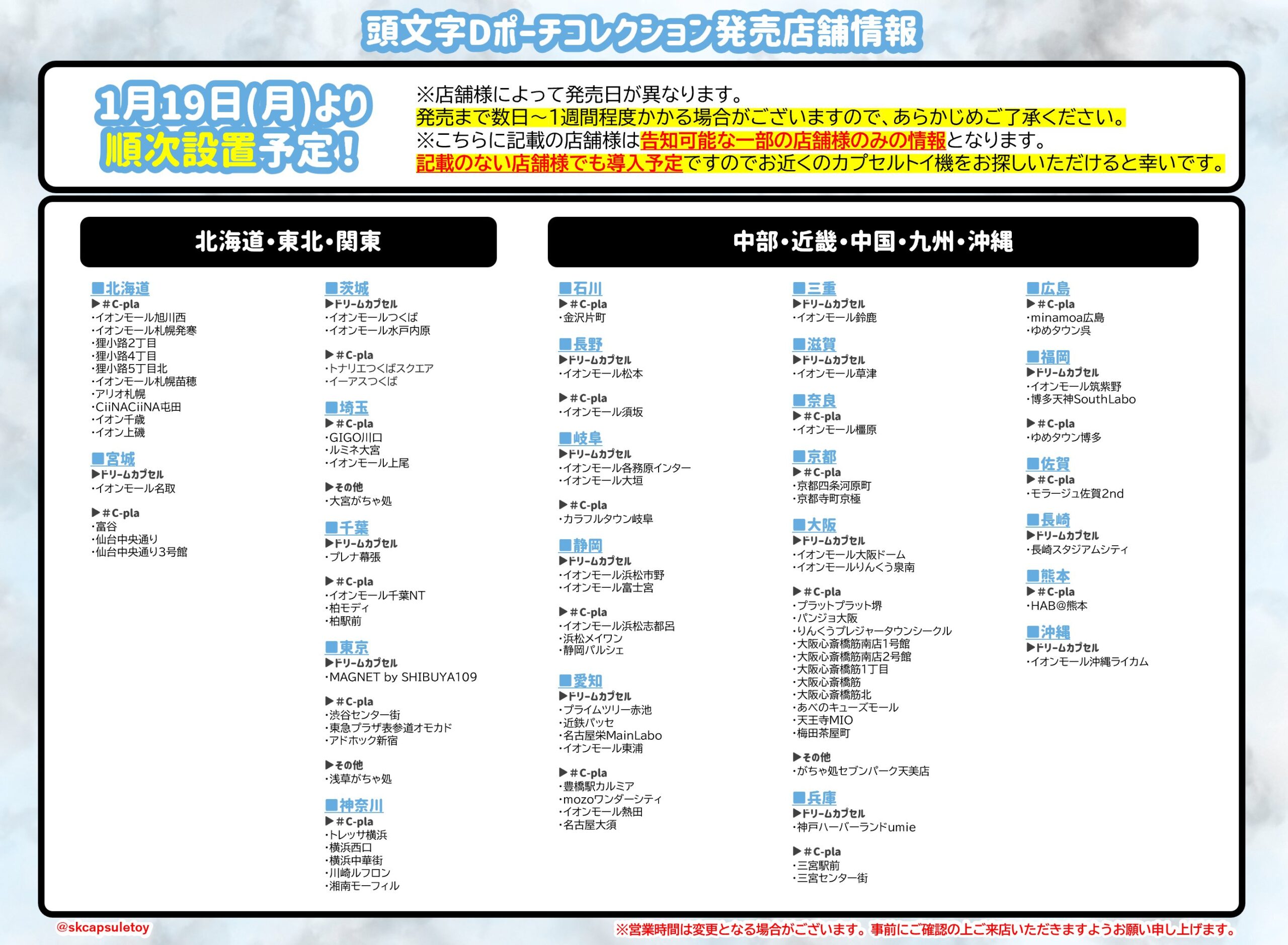 バンダイ(ガシャポン)イオンモール(ガシャポンのデパート)、ヨドバシカメラ、ビックカメラ、エディオン、JR駅構内、コンビニ、namco、ラウンドワン、タイトーステーション、トイザらス、ロフト、ドン・キホーテ、紀伊國屋書店、TSUTAYA など