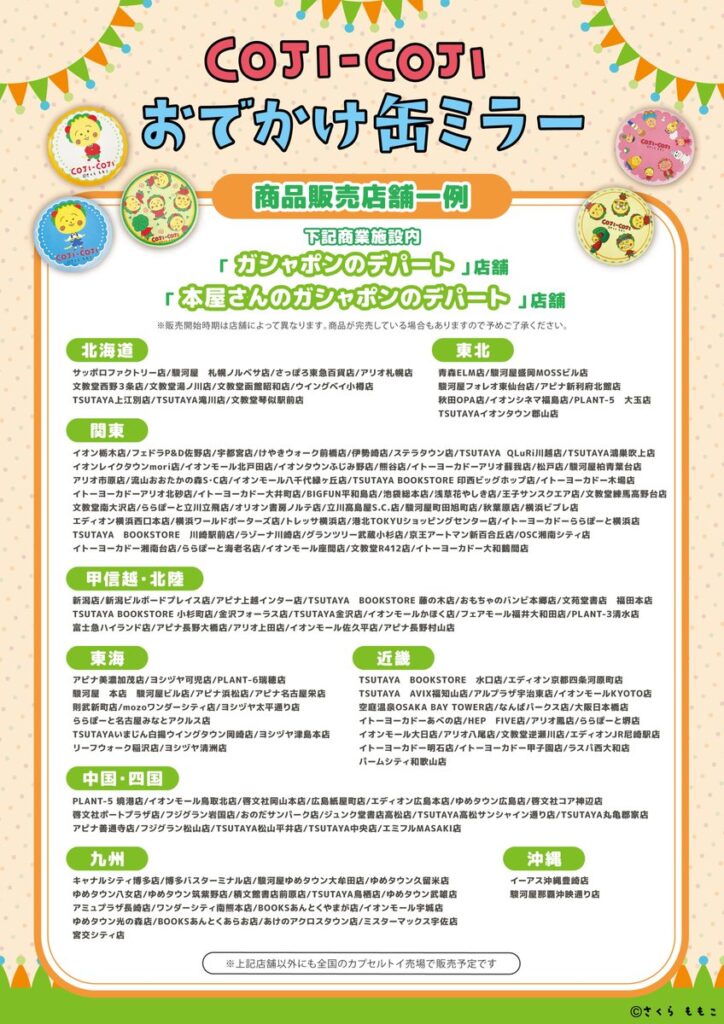 | バンダイ(ガシャポン) | イオンモール(ガシャポンのデパート)、ヨドバシカメラ、ビックカメラ、エディオン、JR駅構内、コンビニ、namco、ラウンドワン、タイトーステーション、トイザらス、ロフト、ドン・キホーテ、紀伊國屋書店、TSUTAYA など |