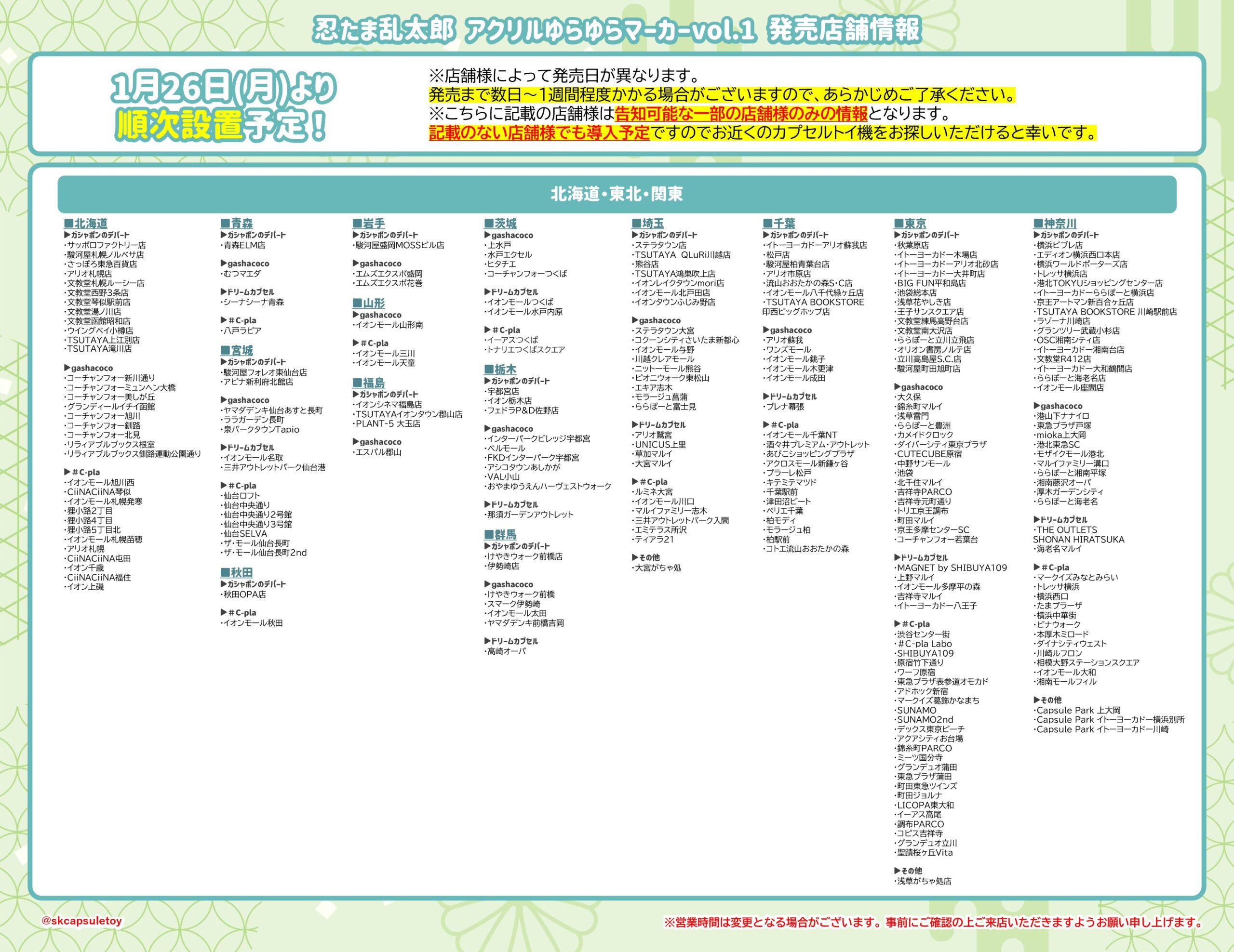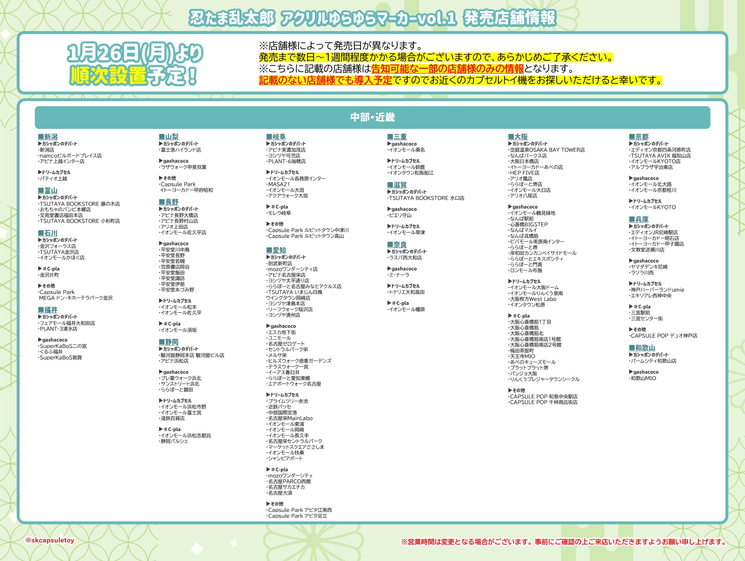 バンダイ(ガシャポン)イオンモール(ガシャポンのデパート)、ヨドバシカメラ、ビックカメラ、エディオン、JR駅構内、コンビニ、namco、ラウンドワン、タイトーステーション、トイザらス、ロフト、ドン・キホーテ、紀伊國屋書店、TSUTAYA など