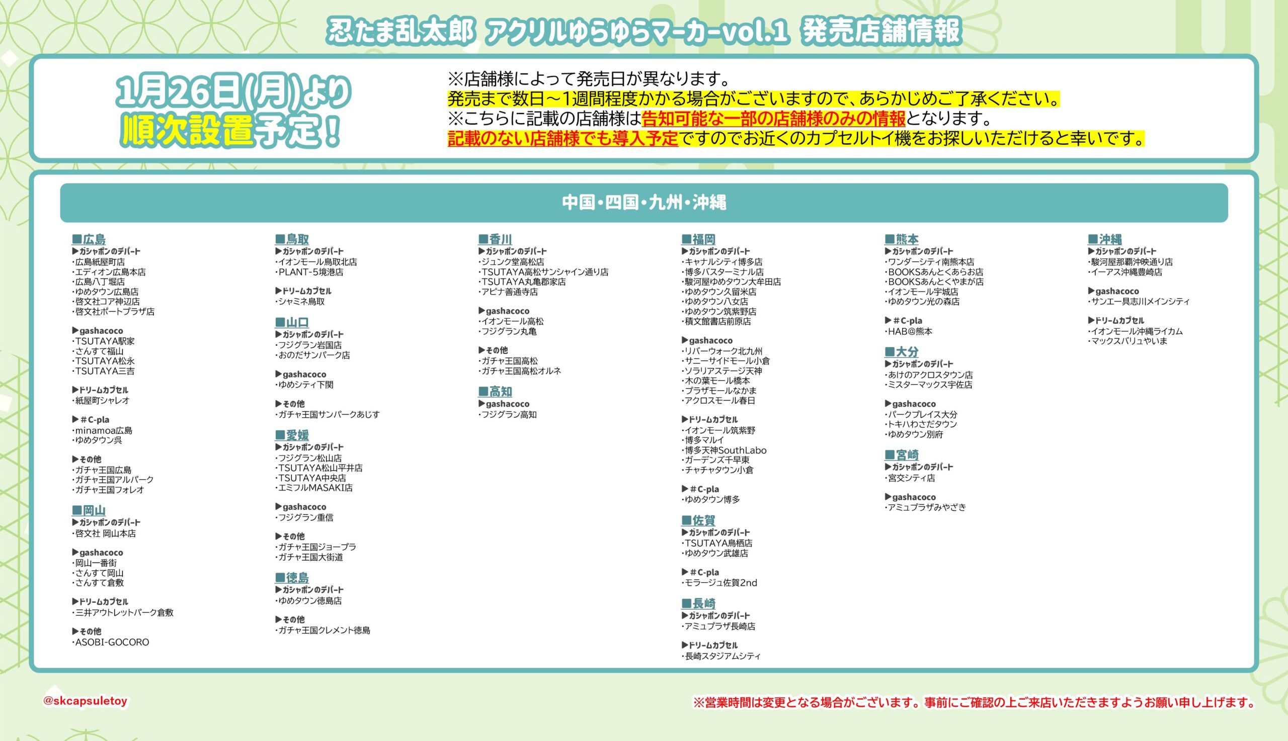 トイズキャビンC-pla、ヴィレッジヴァンガード、ロフト、ドン・キホーテ、ヨドバシカメラ、ビックカメラ、ジュンク堂、TSUTAYA、WonderGOO、namco、セガ、地域のホビーショップや中古ショップ など