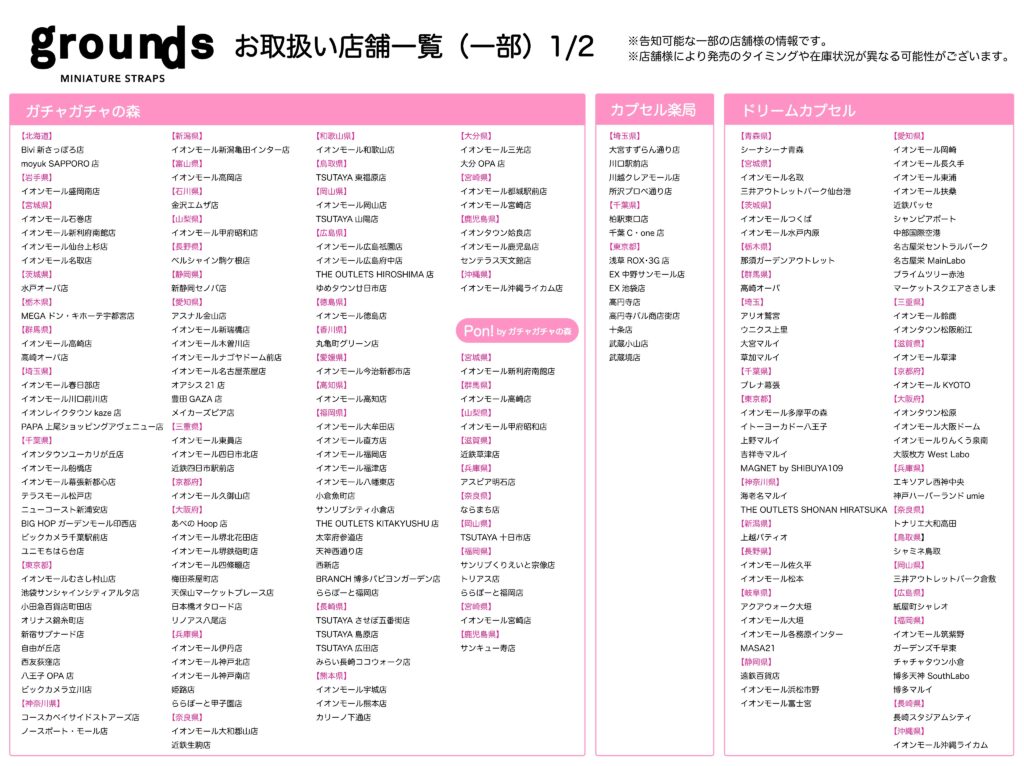 | バンダイ(ガシャポン) | イオンモール(ガシャポンのデパート)、ヨドバシカメラ、ビックカメラ、エディオン、JR駅構内、コンビニ、namco、ラウンドワン、タイトーステーション、トイザらス、ロフト、ドン・キホーテ、紀伊國屋書店、TSUTAYA など |