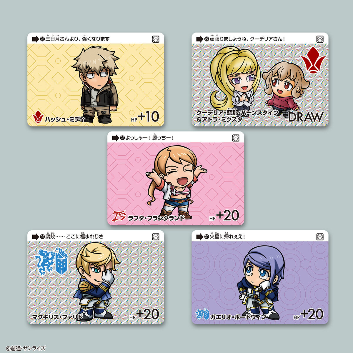第1期、第2期の登場キャラクターやモビルスーツ達が、ディフォルメされて全35種のSDガンダムカードダスとして登場!