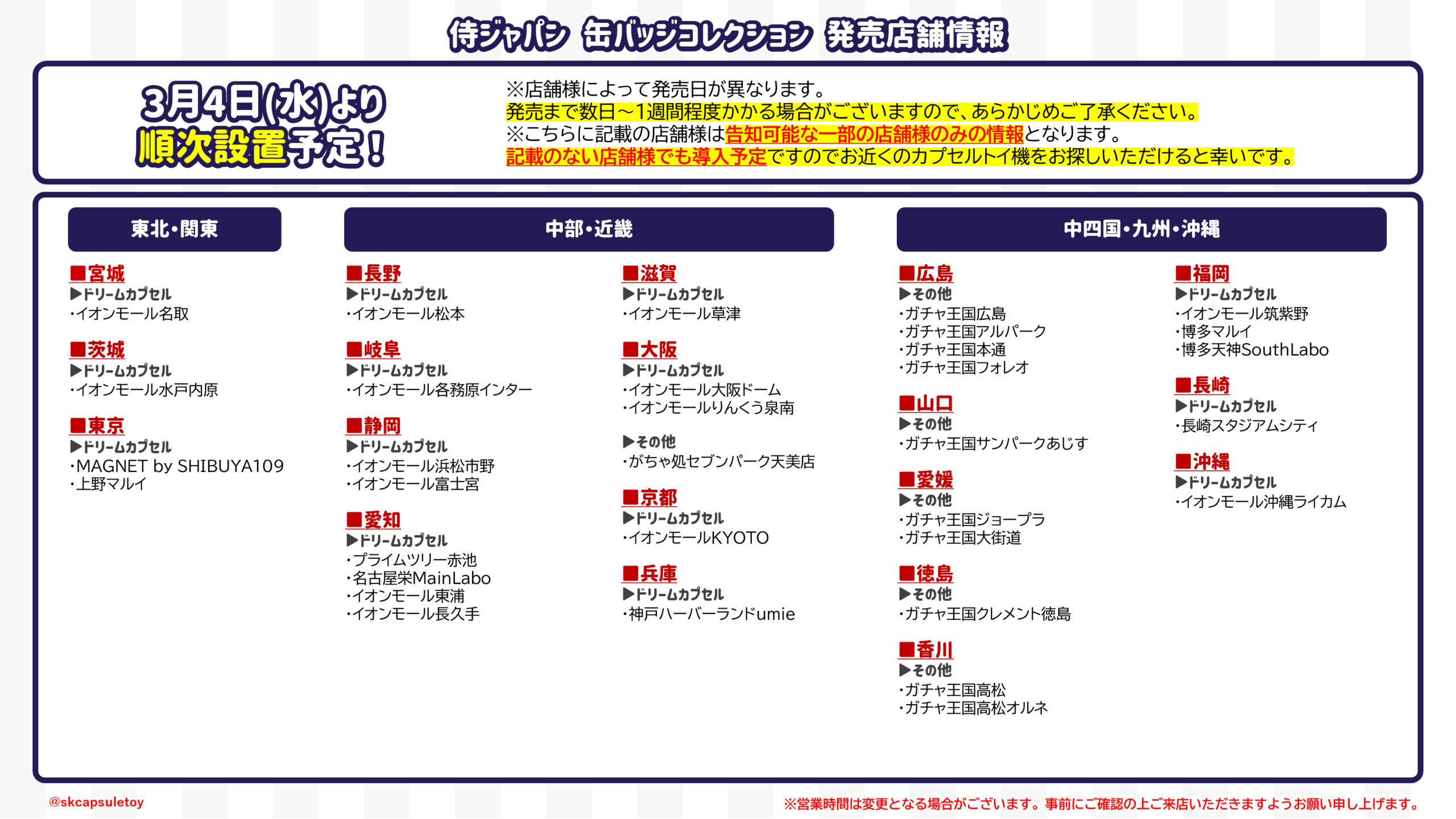 | バンダイ(ガシャポン) | イオンモール(ガシャポンのデパート)、ヨドバシカメラ、ビックカメラ、エディオン、JR駅構内、コンビニ、namco、ラウンドワン、タイトーステーション、トイザらス、ロフト、ドン・キホーテ、紀伊國屋書店、TSUTAYA など |