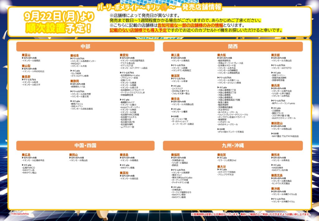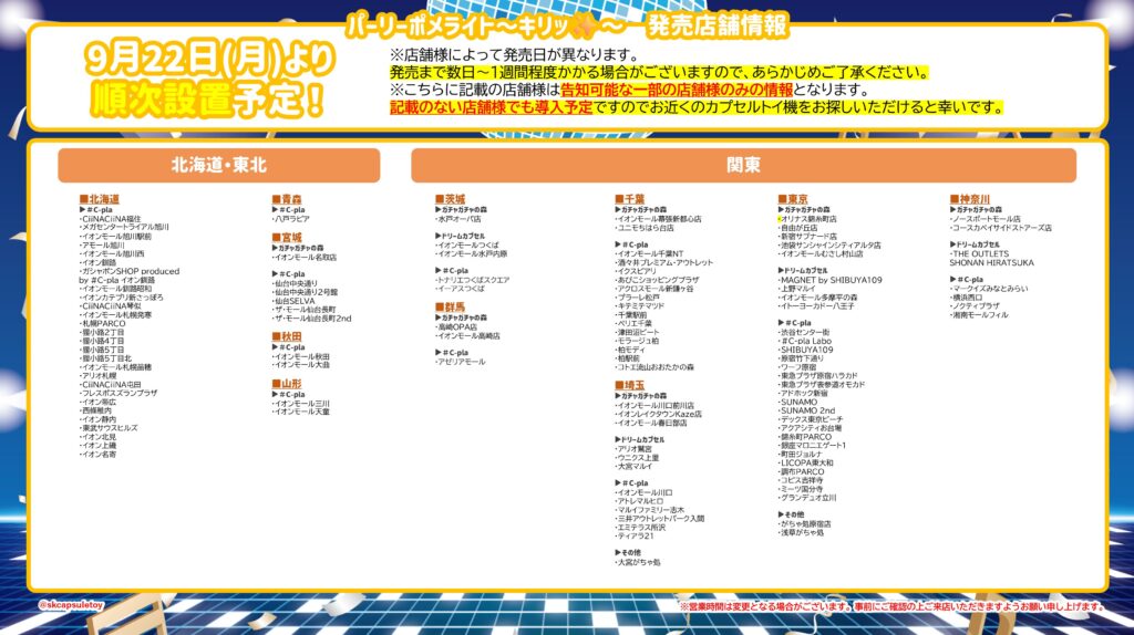 バンダイ(ガシャポン)イオンモール(ガシャポンのデパート)、ヨドバシカメラ、ビックカメラ、エディオン、JR駅構内、コンビニ、namco、ラウンドワン、タイトーステーション、トイザらス、ロフト、ドン・キホーテ、紀伊國屋書店、TSUTAYA など
