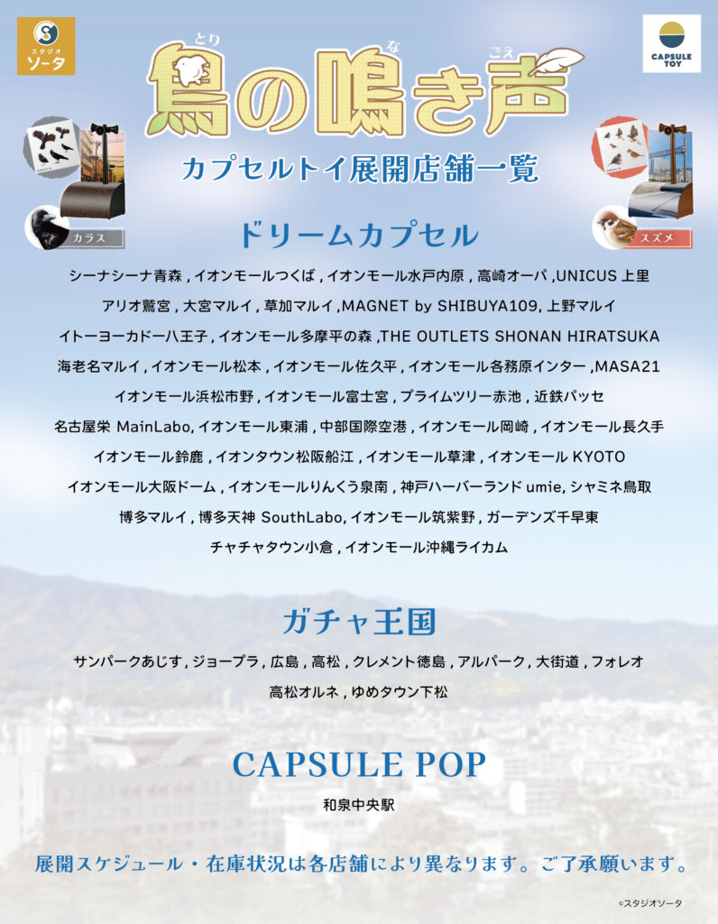 | バンダイ(ガシャポン) | イオンモール(ガシャポンのデパート)、ヨドバシカメラ、ビックカメラ、エディオン、JR駅構内、コンビニ、namco、ラウンドワン、タイトーステーション、トイザらス、ロフト、ドン・キホーテ、紀伊國屋書店、TSUTAYA など |