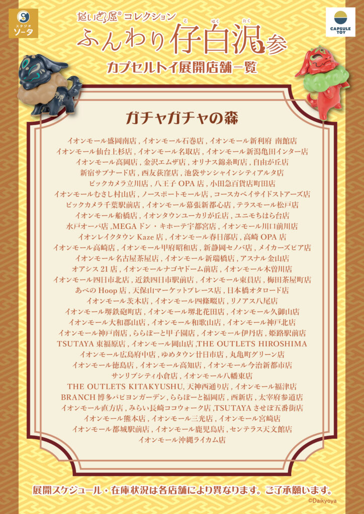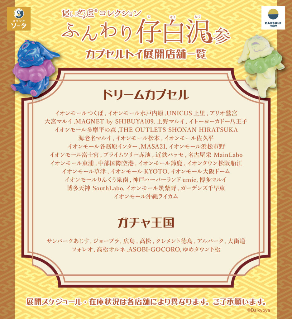 バンダイ(ガシャポン)イオンモール(ガシャポンのデパート)、ヨドバシカメラ、ビックカメラ、エディオン、JR駅構内、コンビニ、namco、ラウンドワン、タイトーステーション、トイザらス、ロフト、ドン・キホーテ、紀伊國屋書店、TSUTAYA など