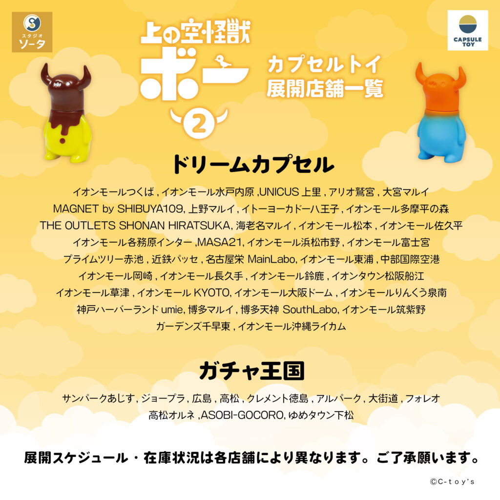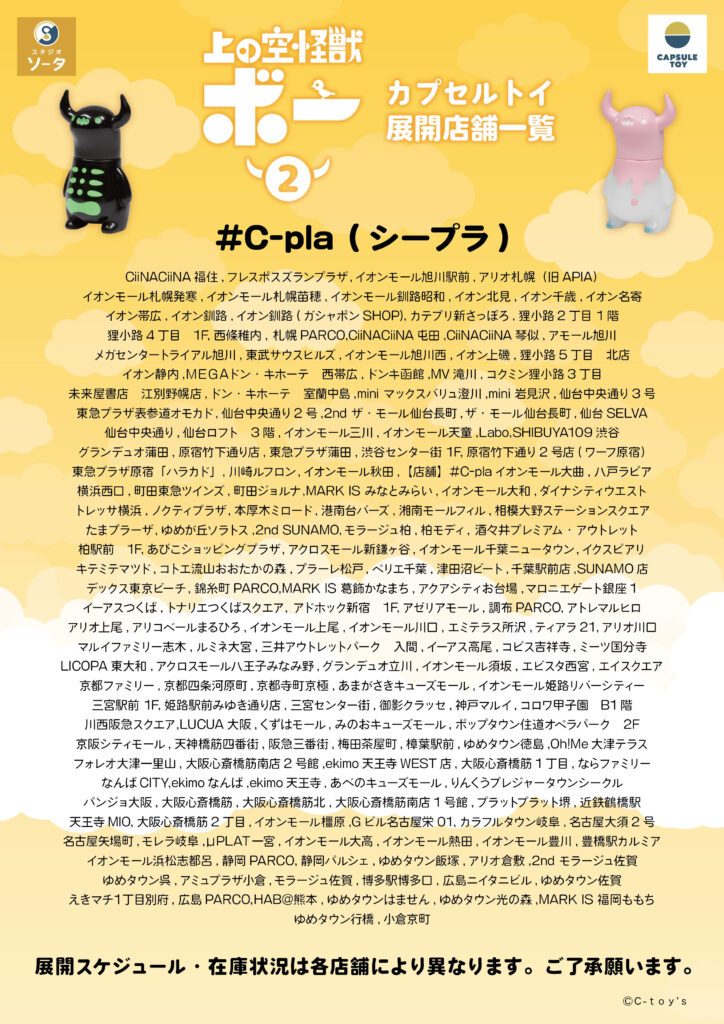 | トイズキャビン | C-pla、ヴィレッジヴァンガード、ロフト、ドン・キホーテ、ヨドバシカメラ、ビックカメラ、ジュンク堂、TSUTAYA、WonderGOO、namco、セガ、地域のホビーショップや中古ショップ など |