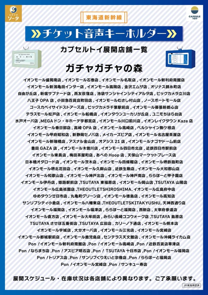 | ガシャポン(バンダイ) | イオンモール(ガシャポンのデパート)、ヨドバシカメラ、ビックカメラ、エディオン、JR駅構内、コンビニ、namco、ラウンドワン、タイトーステーション、トイザらス、ロフト、ドン・キホーテ、紀伊國屋書店、TSUTAYA など |